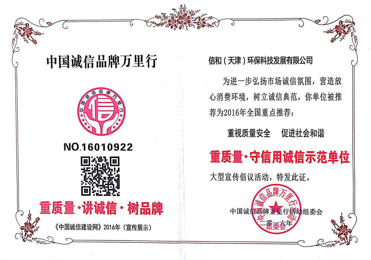 “質量就是生命”。信和重質量、守信用,被中國誠信品牌萬里行推薦“誠信示范單位”、“AAA資信等級”、“AAA級誠信經營示范單位”、“誠信經理人榮譽證書”、“誠信企業家榮譽證書”、“中國產品質量放心達標企業”、“誠信品牌聯盟會員單位”、“中國質量誠信AAA級品牌企業”、“中國百強優秀企業”、“節能環保推廣產品”、“全國科技創新企業”等榮譽稱號。